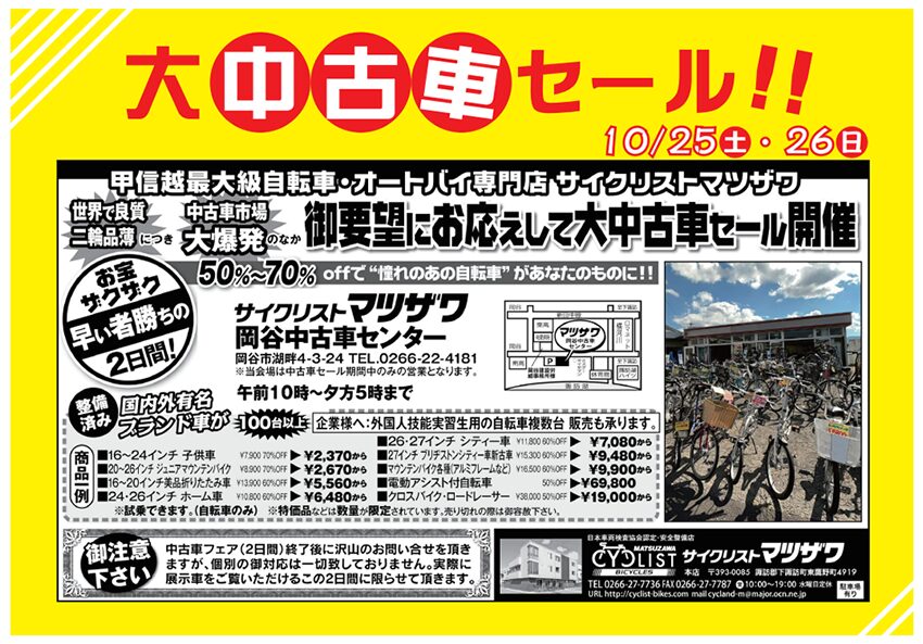 10月25日・26日【大中古車セール】! By サイクリスト マツザワIn イベントPosted 10月 5, 2025 10月25日・26日【大中古車セール】開催します!! お手頃な中古車をお探しの方お待たせいたしました...